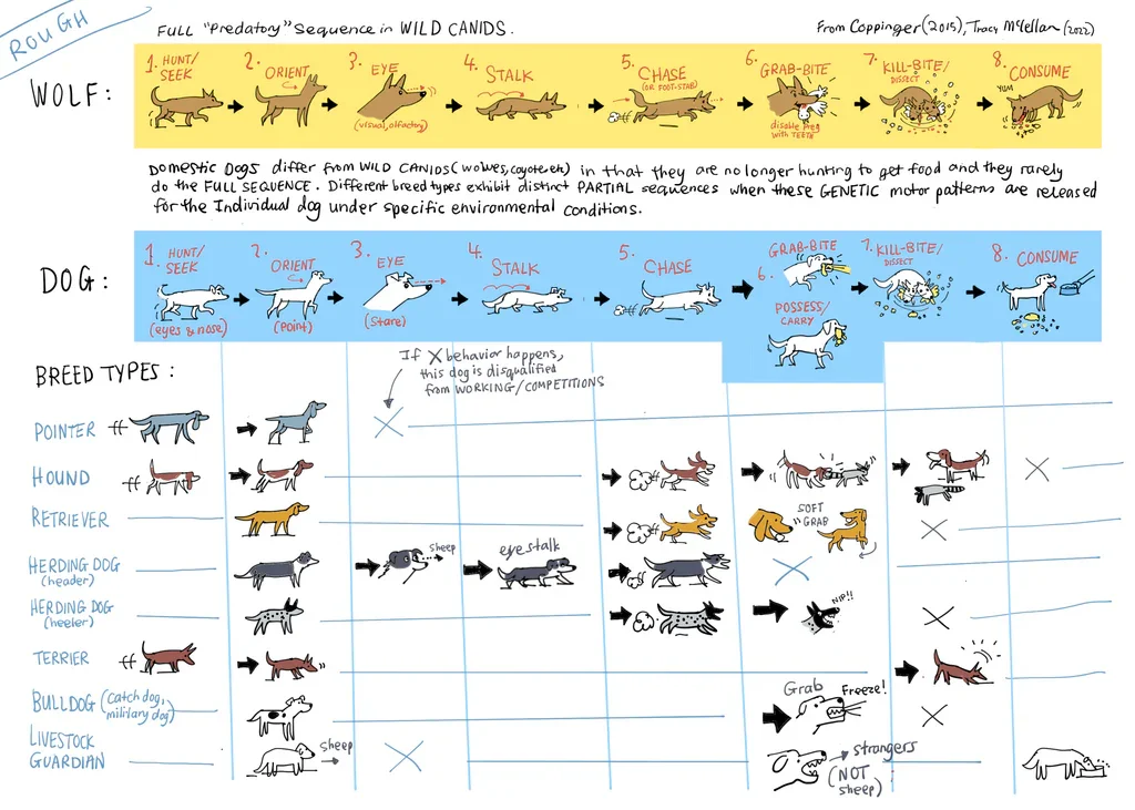 All dogs are predators. They, along with wolves and wild canines, have something called a predatory sequence. (Picture below). However, modern dogs don’t typically get to indulge in the “dissect” stage of this, because they are not still hunting rabbits through the woods with ancient humans. What I mean to say is this: All dogs want to destroy something. If they aren’t supplied with something to destroy — i.e. a cardboard box, chew toy, rope, old socks full of holes — they will find something to destroy. And you probably won’t like what it is.